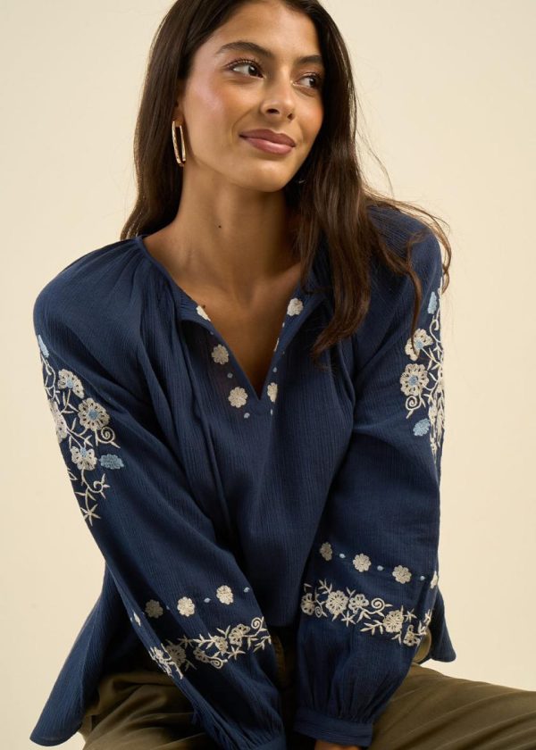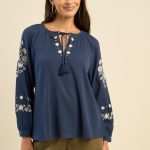 Succombez au charme de la blouse TOKAMA en gaze de coton, ample et fluide, avec ses manches longues bouffantes ornées de broderies délicates. L’encolure ronde est sublimée par une broderie au col, agrémentée d’un lien de resserrage et d’un pompon, apportant une touche de fraîcheur et d’élégance. Le tissu léger assure confort et féminité.
