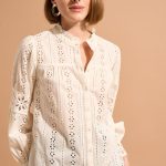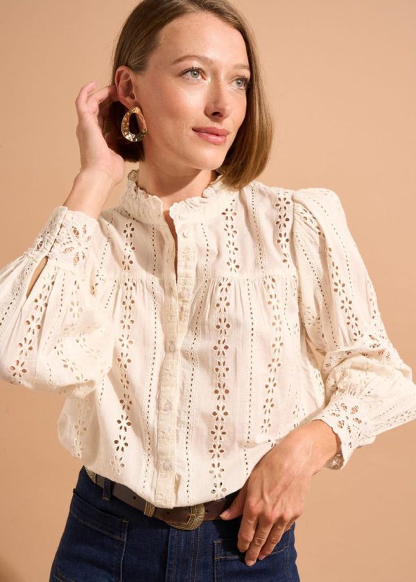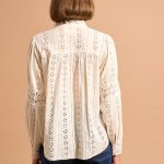 La chemise CAJOSIANE associe charme romantique et confort naturel. Son volume fluide en 100% coton est sublimé par des détails raffinés comme la broderie anglaise et le col montant froncé.