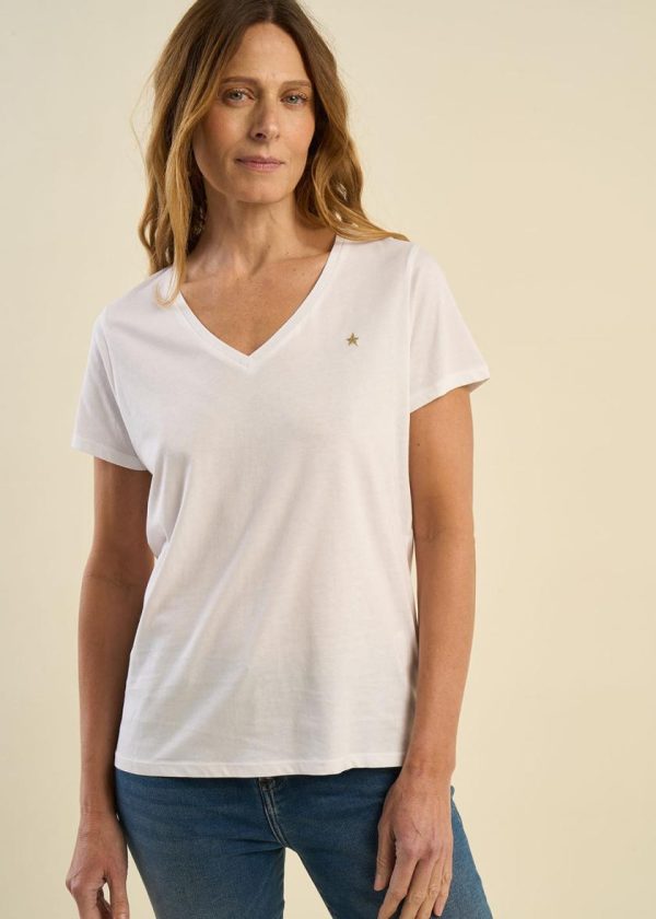Le tee-shirt THELMA allie confort et style avec une élégance discrète. Avec ses manches courtes et son col V flatteur, il sublime toutes les silhouettes. Son détail signature, une étoile glitter ton sur ton délicatement apposée à la poitrine, ajoute une touche d’éclat subtile. Un essentiel polyvalent, parfait pour compléter vos tenues du quotidien.